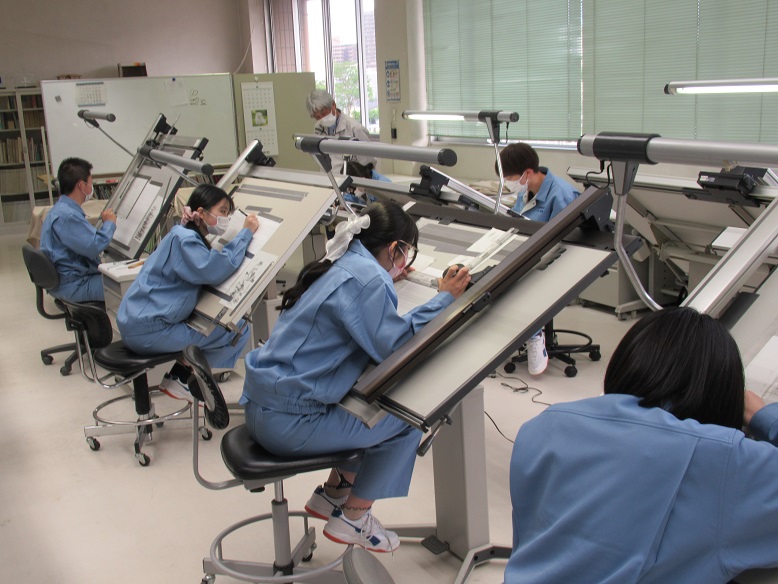 本日は設備製図の実習を行いました。今回は熱源機器廻りの図面です。ヘッダー工法により各室へ冷水又は温水を熱交換器へ送り冷暖房を行います。ドラフターを使用し,集中して作業に取り組んでいました。