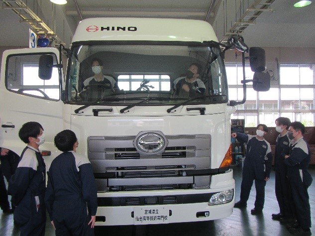日野自動車株式会社様、宮城日野自動車株式会社様からトレーラーヘッドが寄贈されました。この車両は、様々な物をけん引するとてもパワーがある車両です。式典後、運転席に座って乗用車との視界の違いを体験し、エアサスペンションの作動確認を行いました。日野自動車株式会社様、宮城日野自動車株式会社様ありがとうございました。