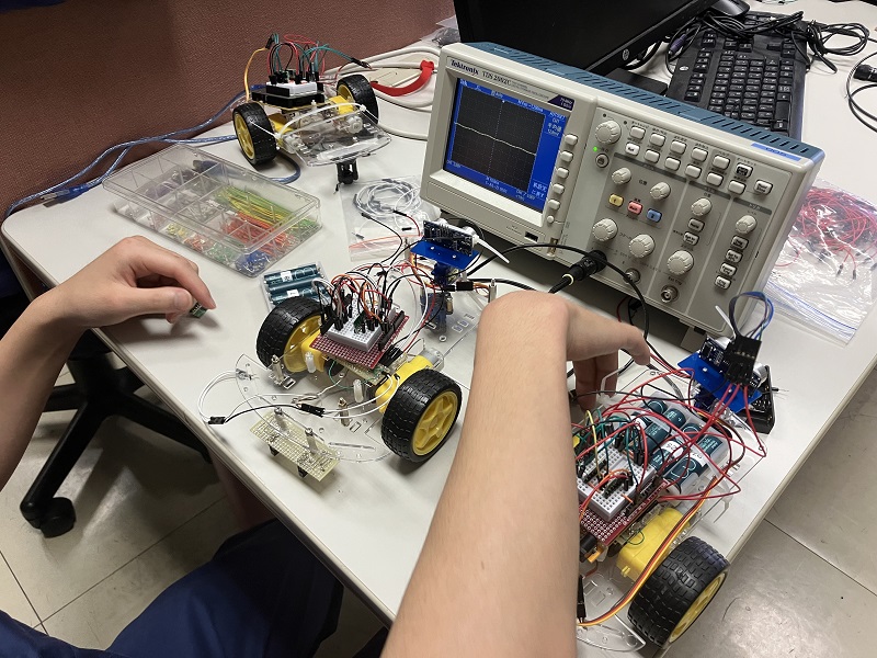 電子工学では現在「オペアンプ」について勉強しています。今日はユニバーサル基板に実際に回路を作成して、オシロスコープを使って波形の観測を行っています。実際に回路を作成、観測することによって回路の理解が深まりました。