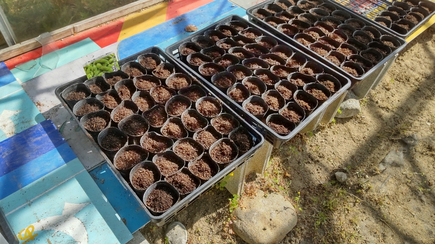 花壇に植える草花の種蒔きを行いました。順調に発芽するよう温室の中で育てます。