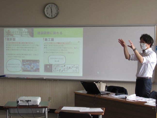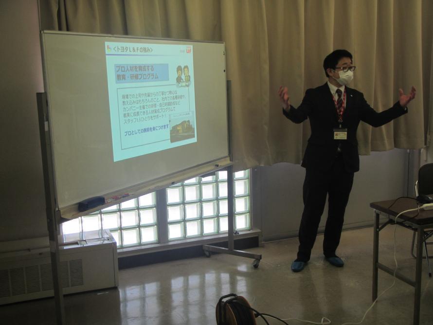 株式会社北光様(栗原市)より、総務Gリーダー様及び修了生(1名)をお迎えし、機械エンジニア科1年生対象の職業講話を開催しました。車載電装部品や電子機器部品に使用される精密プレス部品加工を得意としており、県北にある企業の中でも高い技術力を有する会社です。総務Gリーダー様から、「金型設計」~「完成品」まで独自の”一貫生産システム”を採用していること、3D-CAD/CAMによる金型製作、部品加工では、プレス成型や射出成型等、多様な生産形態によるスピーディー・フレキシブルな対応で、お客様のニーズにお応えしていること等を学びました。