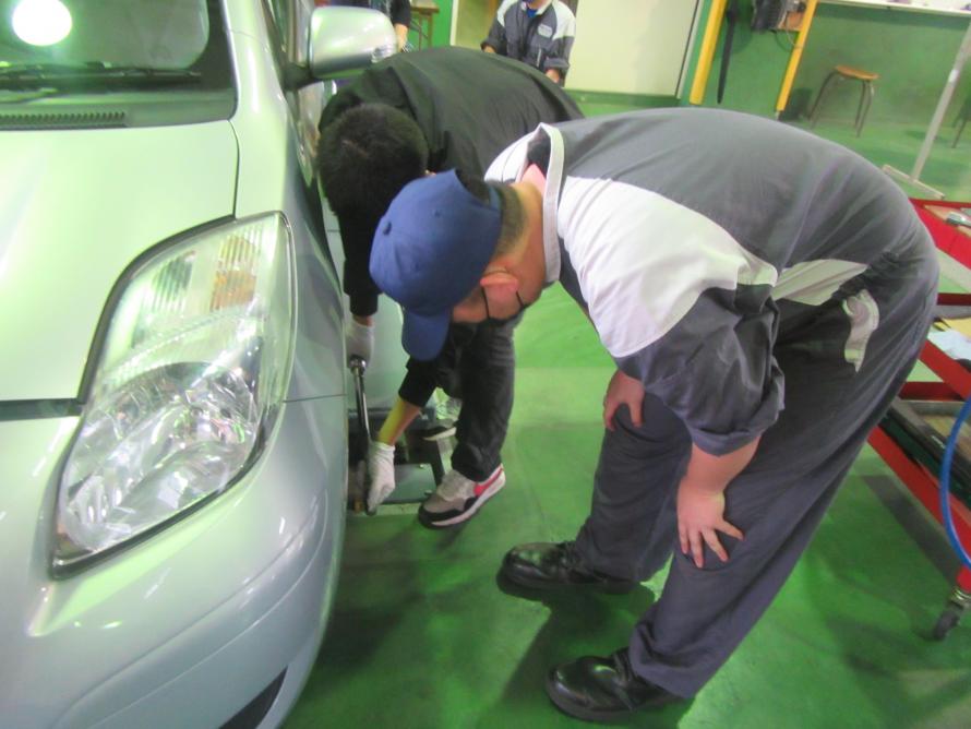 自動車整備科2年生のタイヤ交換実習です。マイクロバスのタイヤ交換をしました。