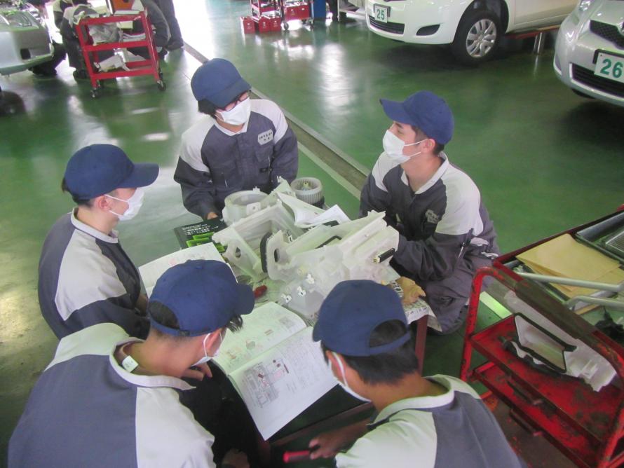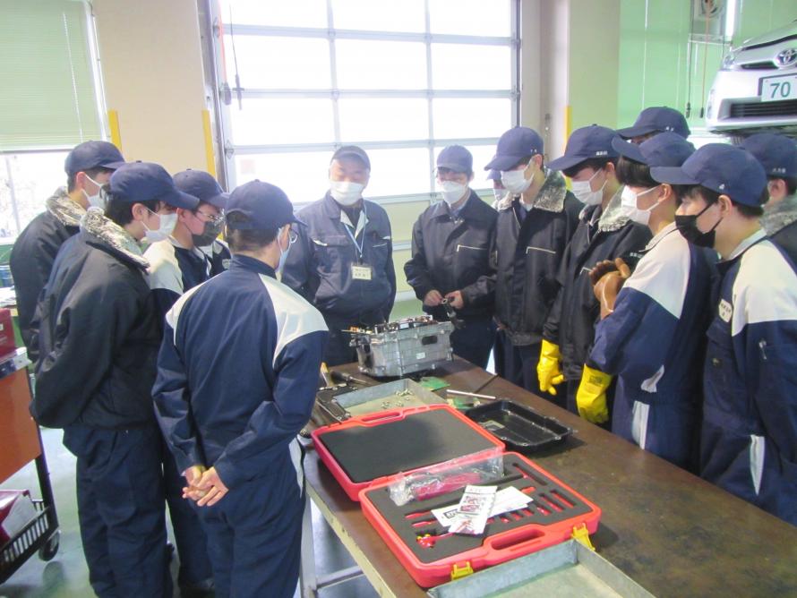 電気自動車やハイブリッド車には高電圧のものが使用されています。車両に搭載されている装置を、絶縁工具を使用して実際に分解し、構造の確認をしました。