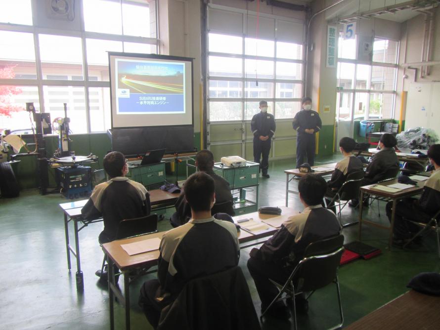 宮城スバル自動車株式会社の営業支援統括部技術支援課及び太白山田店の方から,水平対向エンジンの構造とオーバーホールについてご指導していただきました。