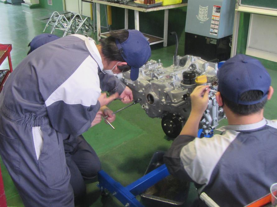 自動車整備科2年生のオーバーホール実習です。エンジンの組み立てをしています。