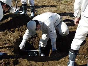 ウッドデッキの位置を決め、基礎を設置する場所を設定した深さまで地面を掘る「根切」をしました。