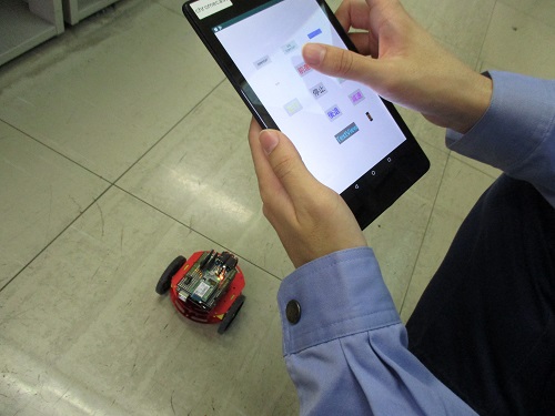 タブレットをコントローラにして、ラジコンを操作しています。タブレットの画面に操作ボタンを作成し、Bluetooth機能を使ってコントロールします。