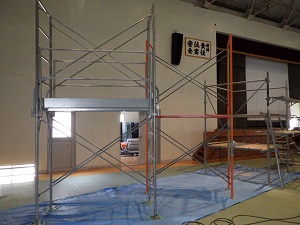 デッキの壁面に貼ってあるシートを剥がす作業のため、ローリングタワー(移動式足場)を組みました。