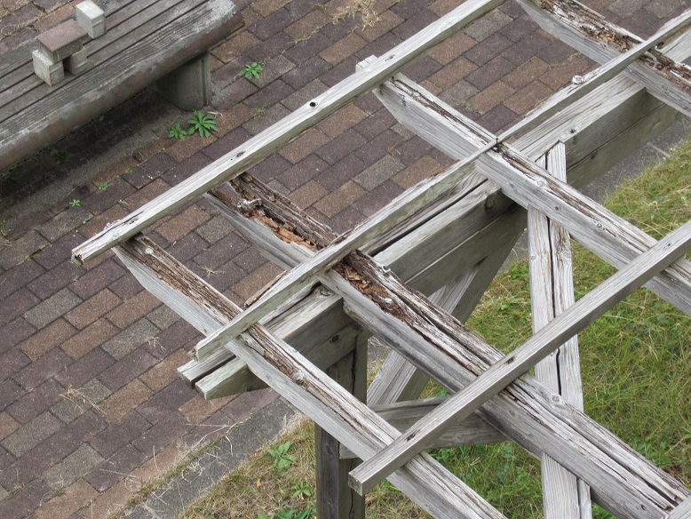 実習棟の中庭にある藤棚を解体しました。この藤棚は、平成20年度に建築製図科の学生が建てたものです。藤を絡ませる棚として当時防腐剤を塗布しないで造ったため、経年劣化で部材は腐朽し、傷みが酷く倒壊の恐れもあったので解体したものです。建物を建てる時は作業が進むごとに強度は増していきますが、解体作業は作業が進むにつれ弱くなっていくので、注意しながら安全第一で作業をしました。