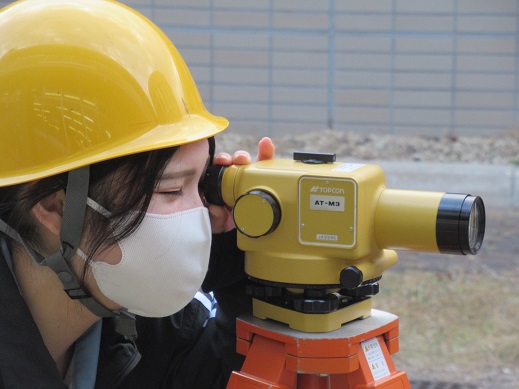 角度を測量するセオドライト測量を学びました。この測量を学ぶことで、敷地の形状の測量や敷地に対する建物の位置を設定する場合等に生きてきます。測量機械には多くの調整螺子が付いているので、学生はまずその螺子が何の機能で使うのかを把握することから始めます。