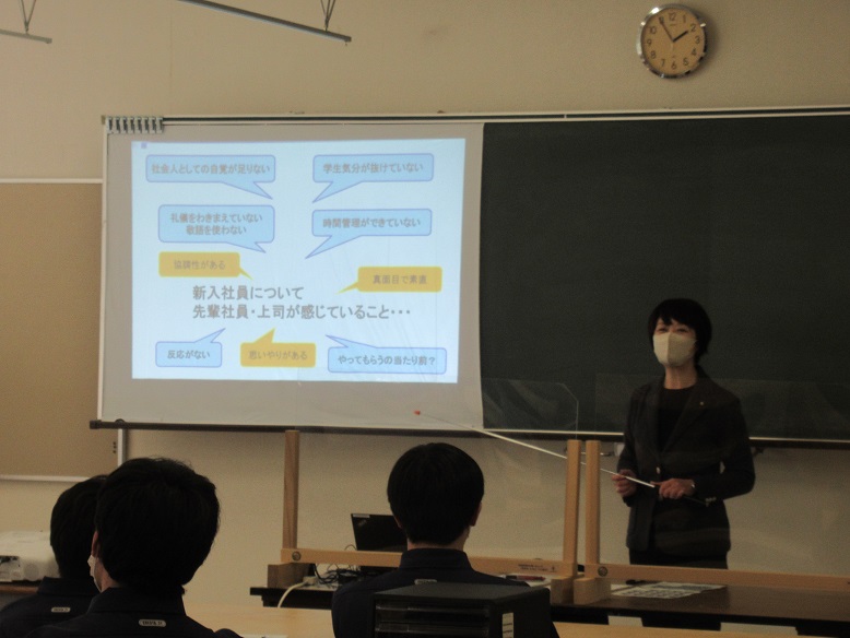4月の入社を控え、社会人としての心得やビジネスマナーについて、みやぎジョブカフェより講師を招き職業講話を実施しました。訓練期間も残り僅かとなった今、講話を受講したことで学生はより就職する実感が湧いてきたようです。