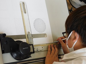 手書きの製図で使用する製図機械の調整方法と扱い方について学びました。どのような機械でも使用していくうちに調整が必要になります。まずは2つの定規を直角にし、各調整ネジの機能・役割について理解しました。