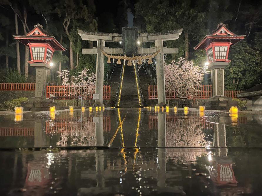 鹽竈神社の境内や参道を中心に、桜が咲いている中を幽玄な灯りが彩ります。202段の石段も鮮やかにライトアップされ、幻想的な夜の鹽竈神社を楽しむことができます。