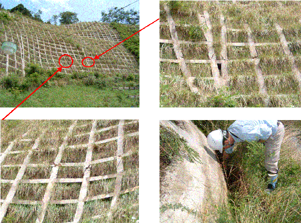 地震により、斜面の中段から下部にかけて、既設の法枠の梁が破断しました。復旧工法としては、梁の被災が軽度な部分は、中詰の部分に受圧版を付けてロックボルトを敷設しました。梁が砕けてしまっている部は、梁を撤去し、十字型鋼製大型受圧版を用いてグランドアンカーを設置しました。