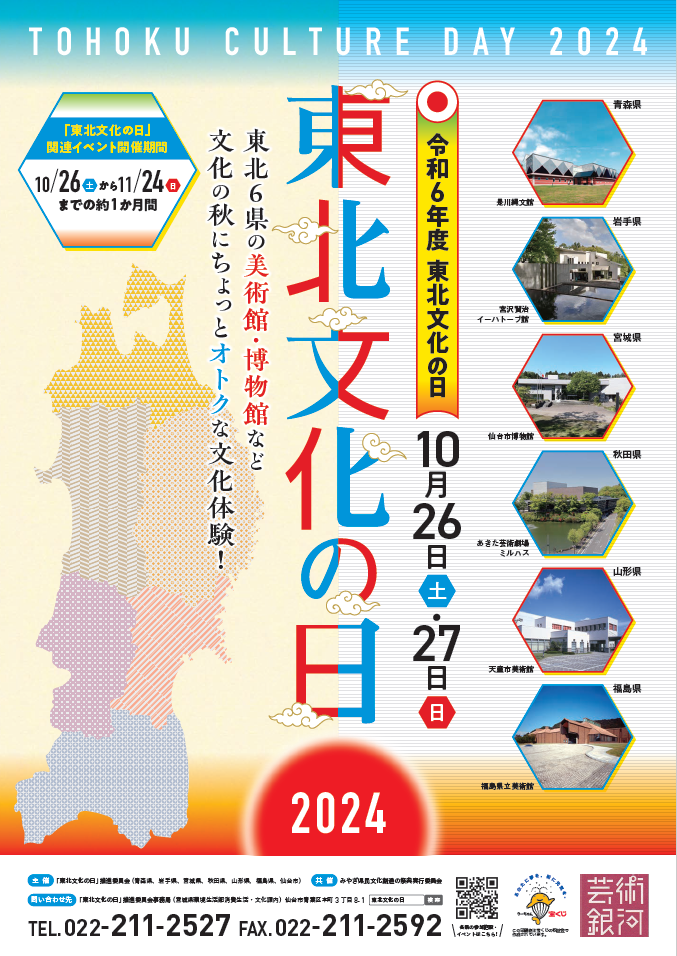東北圏域の特色ある文化資源の情報を総合的に発信し、地域文化に光を当て、東北全体の文化力の発揮を目指すとともに、文化施設を基点として圏域内外の交流人口の拡大を図るため、東北6県及び仙台市が一体となって「東北文化の日」推進事業を実施します。