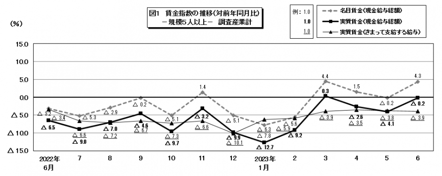 6月の1人平均月間現金給与総額は、規模5人以上で43万2584円、前年同月比4.3%増(規模30人以上で51万3655円、11.3%増)となりました。