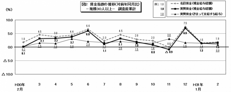 このうち,きまって支給する給与は 前年同月比 2.0%増(規模30人以上で 0.9%増)となりました。