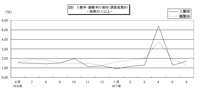 また,図5の対前年同月比及び,図6の入職率,離職率の平成16年各月の数値については改訂をしていないため,旧集計の数値を使用しています。