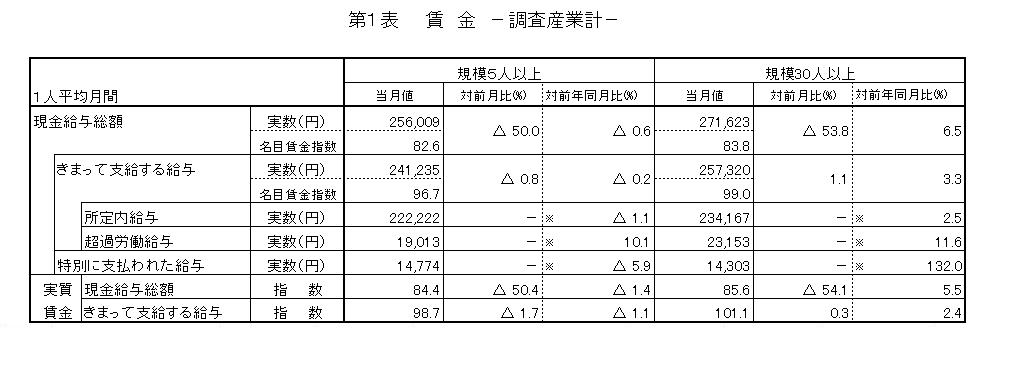 このうち,きまって支給する給与は25万7320円,前年同月と比べ3.3%増(同24万1235円,0.2%減)となり,特別に支払われた給与は1万4303円で132.0%増(同1万4774円,5.9%減)となりました。