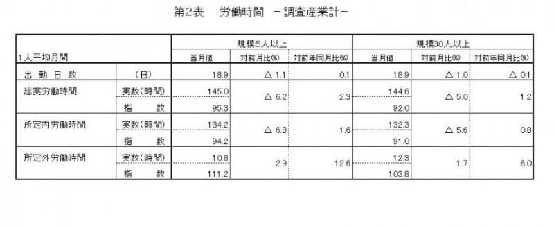 1月の総実労働時間数は,規模30人以上で144.6時間,前年同月比は1.2%増(規模5人以上では145.0時間,2.3%増)となりました。