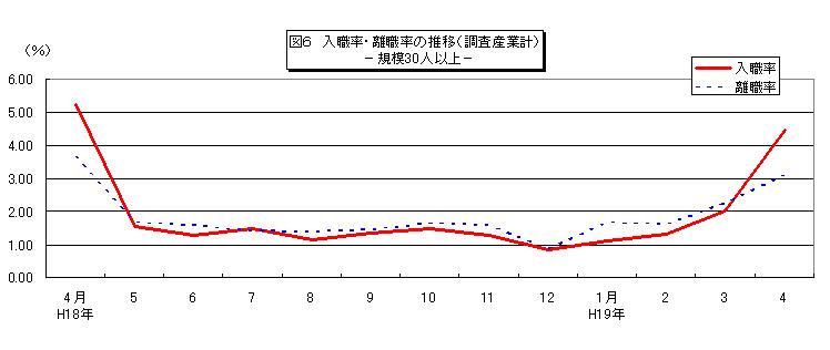入職率,離職率では,入職率は規模30人以上で4.46%と,前年同月に比べ0.77ポイント減少し,離職率は3.11%と,前年同月に比べ0.54ポイント減少となりました。