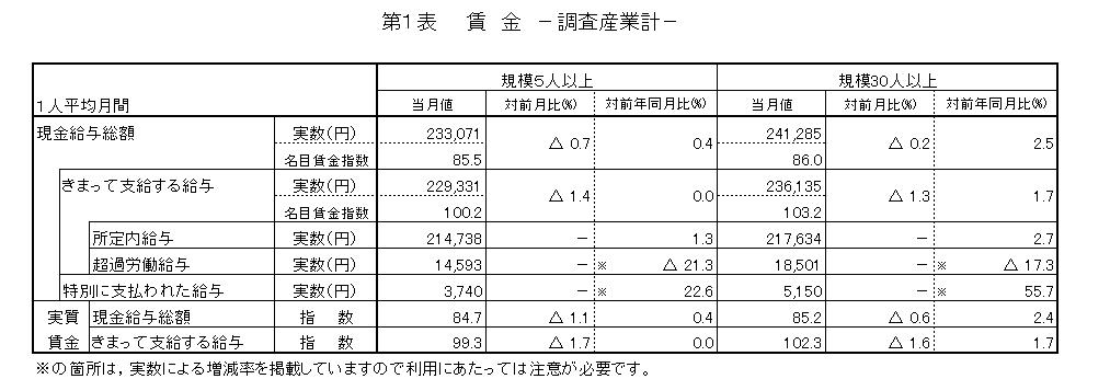 5月の1人平均現金給与総額は,規模30人以上で24万1285円,前年同月と比べ2.5%増(規模5人以上では23万3071円,前年同月と比べ0.4%増)となりました。