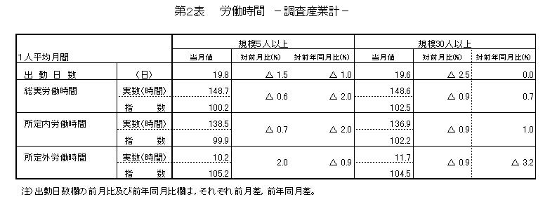 このうち,所定内労働時間は136.9時間,前年同月比1.0%増(同138.5時間,2.0%減)となりました。