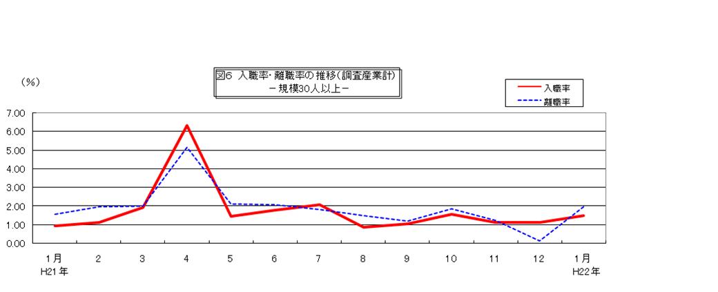 入職率,離職率では,入職率は規模30人以上で1.49%,前年同月比0.53%増。離職率は1.97%,前年同月比0.40%増となりました。