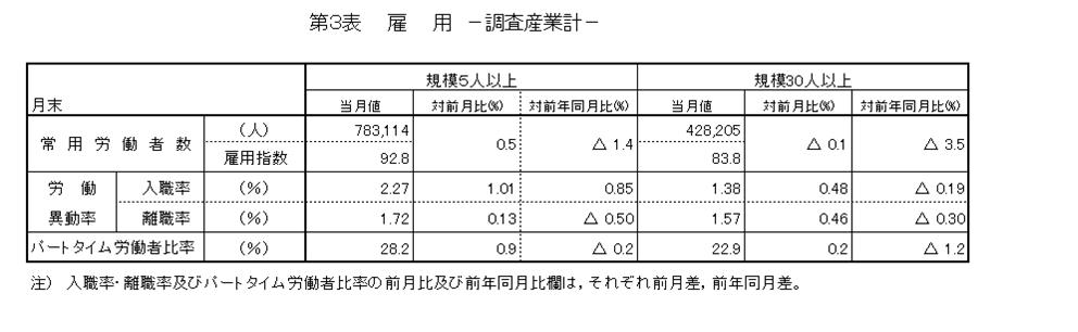 10月の常用労働者数(推計)は,規模30人以上で42万8205人,前年同月比3.5%減(規模5人以上では78万3114人,1.4%減)となりました。