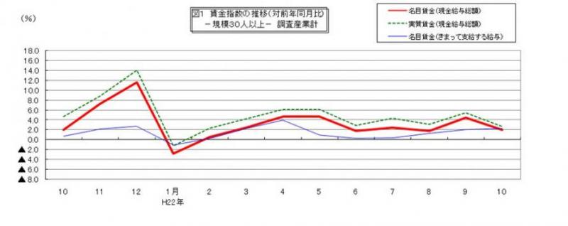 10月の1人平均現金給与総額は,規模30人以上で27万7539円,前年同月比2.0%増(規模5人以上では24万6949円,前年同月比1月1日%増)となりました。