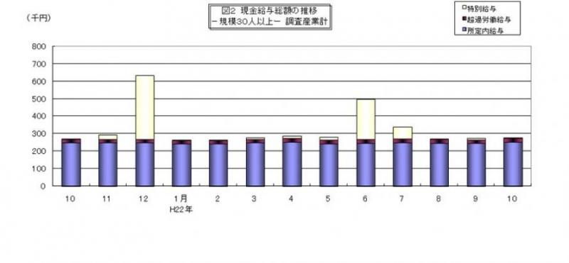 このうち,きまって支給する給与は27万2542円,前年同月比2.2%増(同24万3458,前年同月比1月1日%増)となり,特別に支払われた給与は4997円,前年同月比7.5%減(同 3491円,3.7%増)となりました。