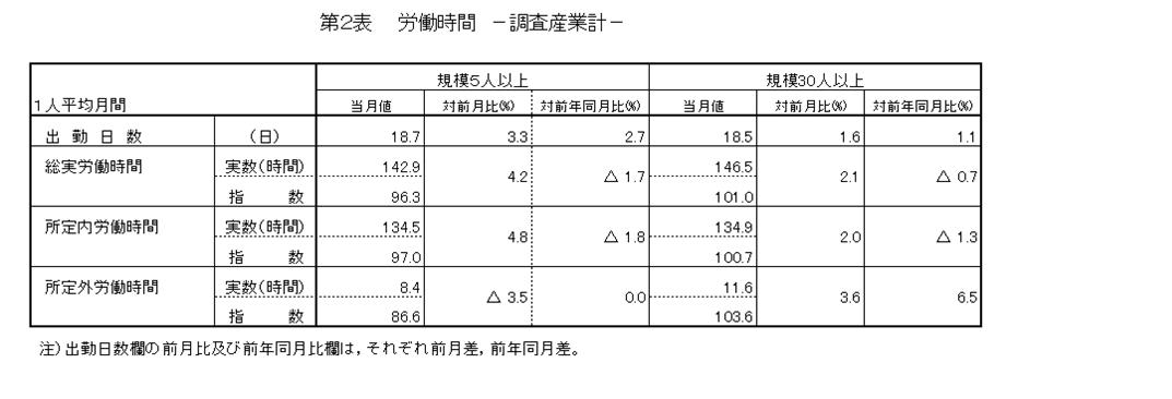2月の総実労働時間数は,規模30人以上で146.5時間,前年同月比0.7%減(規模5人以上では142.9時間,1.7%減)となりました。