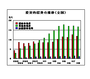 投資的経費とは、その支出の効果が資本形成に向けられ、施設等がストックとして将来に残るものに支出される経費である。我が国の社会資本の整備が欧米に比して遅れていることは一般に指摘されるところであり、特に本県を含む東北地方は社会資本の整備が他の地方に比べ十分ではない。このため、本県においては、国に対し公共投資の重点配分も要請しながら、県土の計画的な基盤整備に努め、道路・河川・下水道などの生活基盤整備、空港・港湾などの流通拠点、ほ場・排水施設などの農業基盤整備等に必要な投資を行うとともに、大学・図書館・総合運動公園等大規模なプロジェクトを展開してきた。